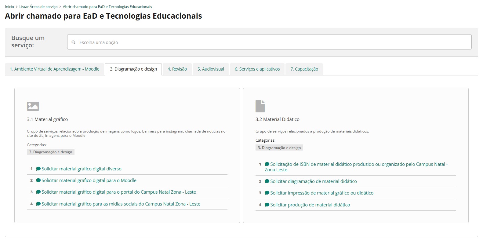 - Solicitar diagramação de material didático: Antes de abrir este tipo de chamado, deve ser providenciado o livro original em formato editável.