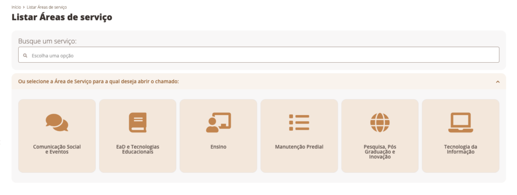 Then, you have to search on the homepage for “Central de Serviços” and click on “+ Abrir Chamado”.