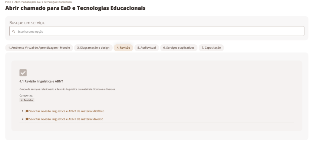 Now, you will select the service category by following this clicks: “EAD e tecnologias educacionais” -> “Revisão”.